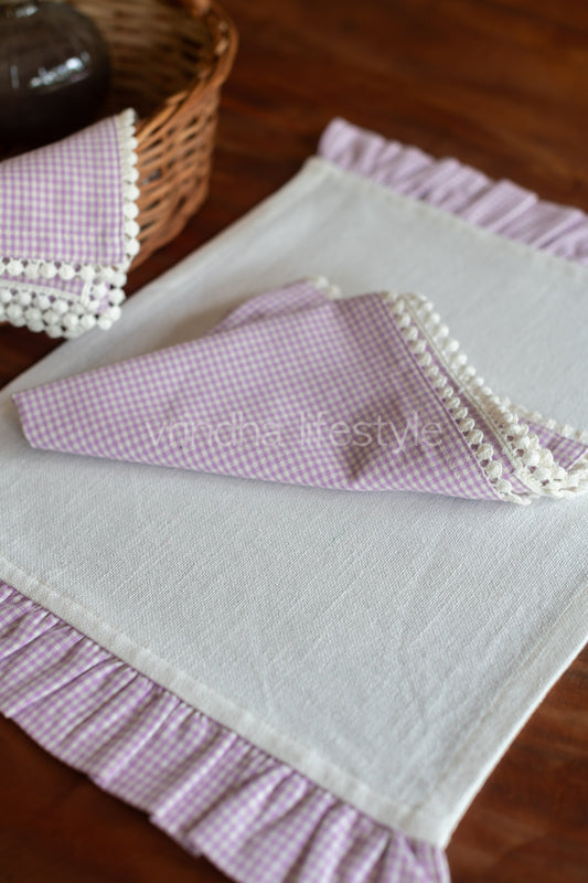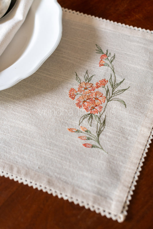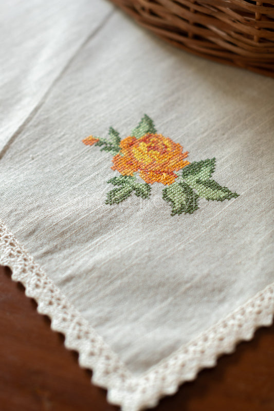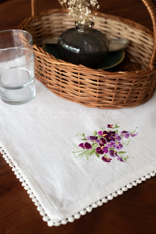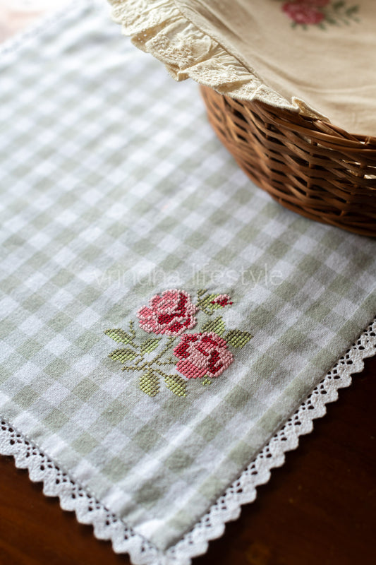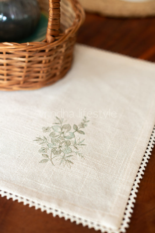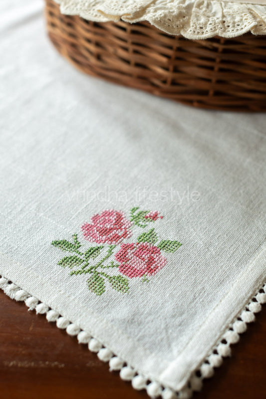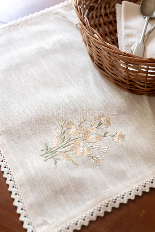 Cotton slub tray mat with cross stitch embroidery and lace detailing