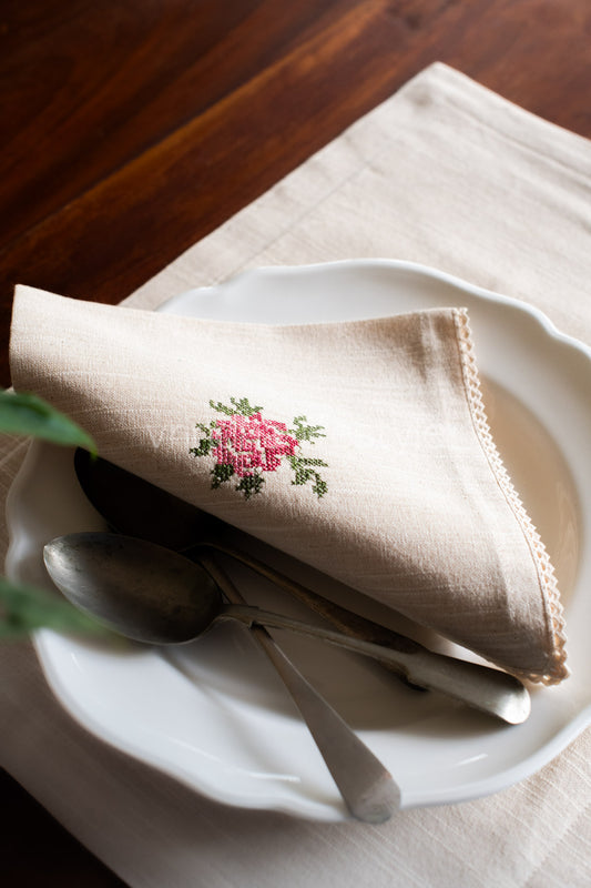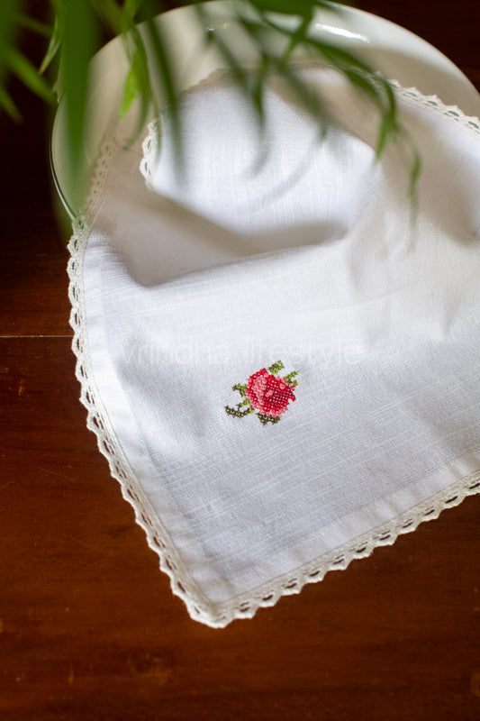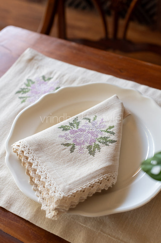 COTTON TABLE NAPKINS with cross stitch embroidery and lace detailing -Set of 2