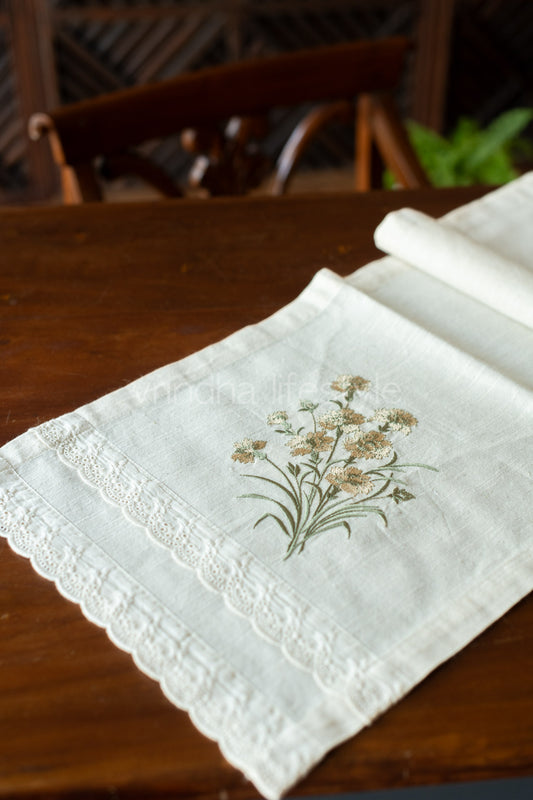 Cotton table runner with embroidery and lace detailing -4 seater -11x62 inches