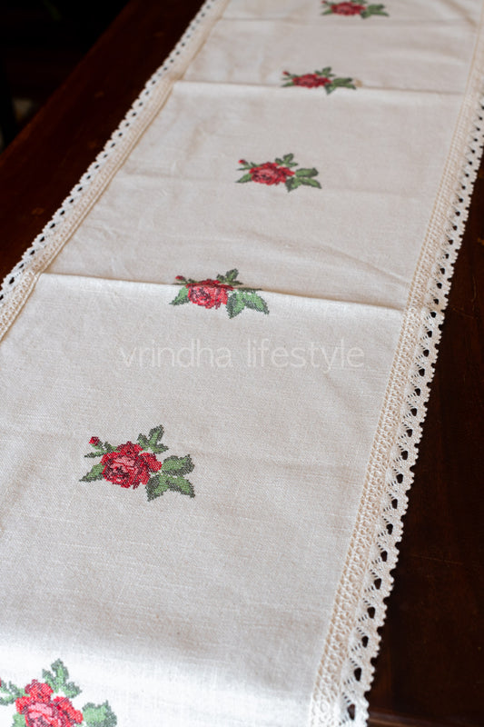 Cotton table runner with floral cross stitch embroidery -11x44 inches
