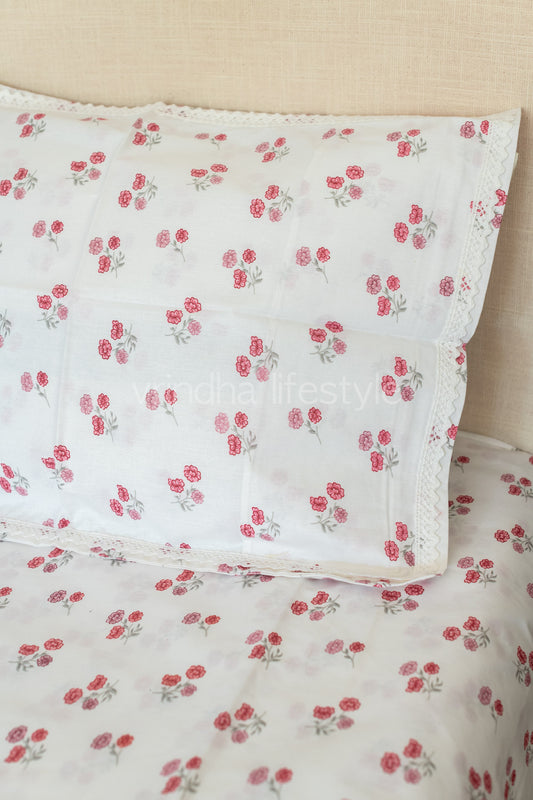 Floral print cotton Bedsheet and pillow covers with lace detailing-Queen size