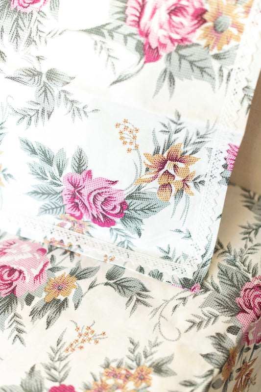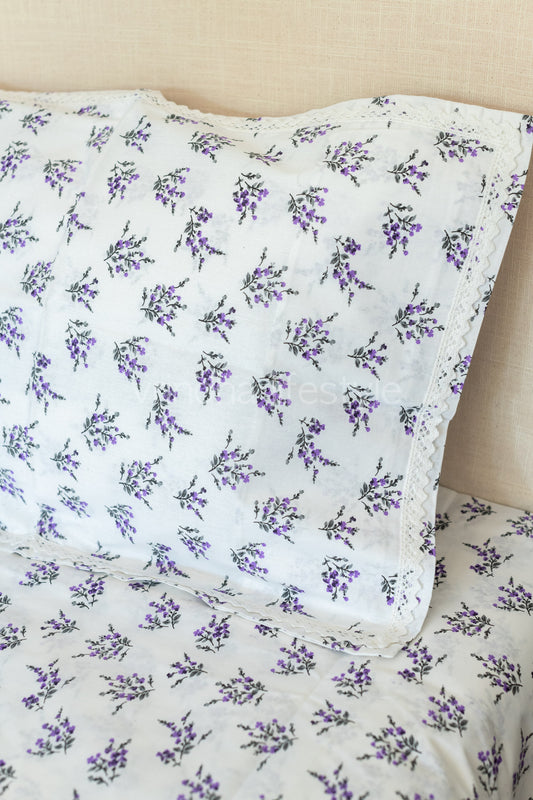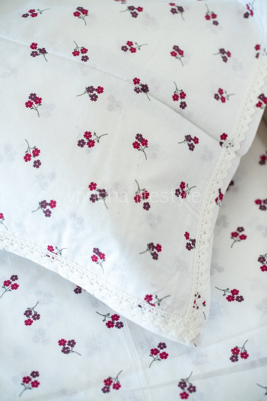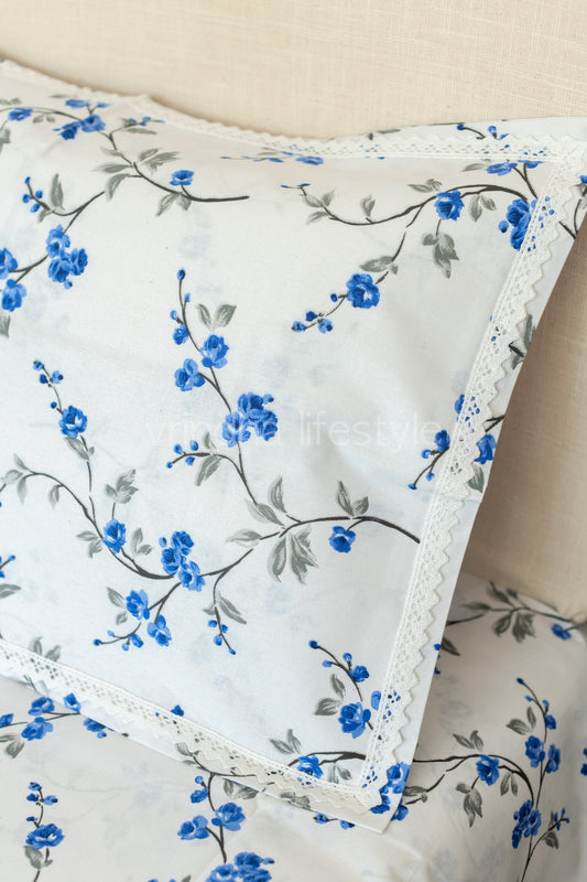 Floral print cotton Bedsheet and pillow covers with lace detailing-Queen size