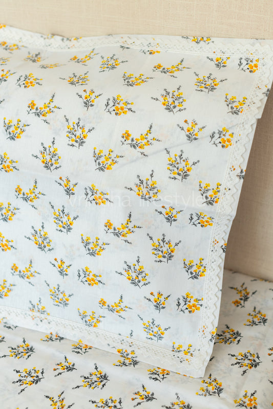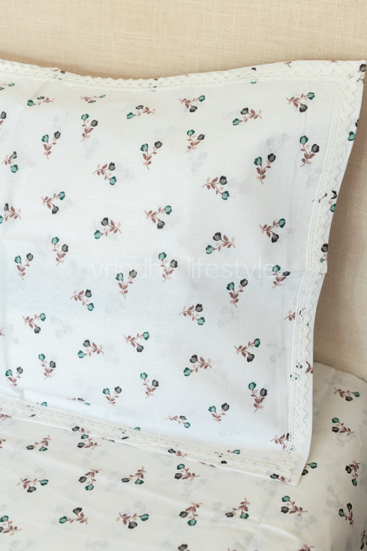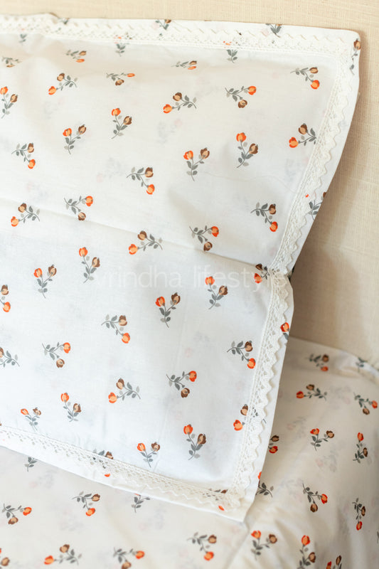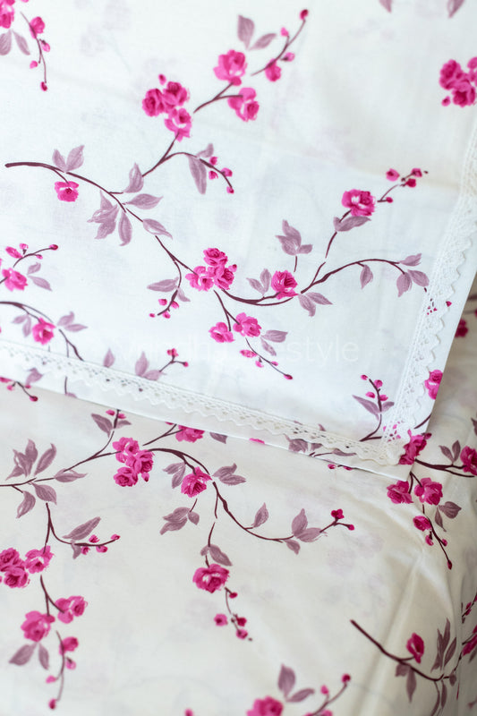 Floral print cotton Bedsheet and pillow covers with lace detailing-Single size