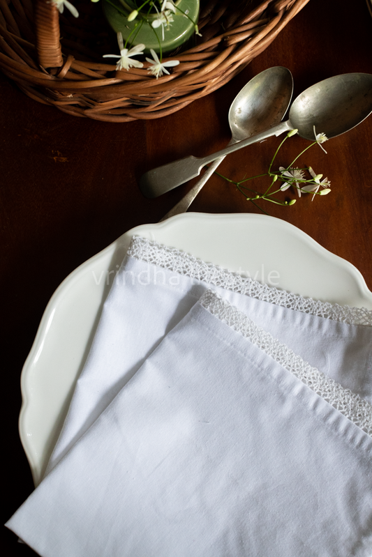 COTTON TABLE NAPKINS with cross stitch embroidery and lace detailing -Set of 2