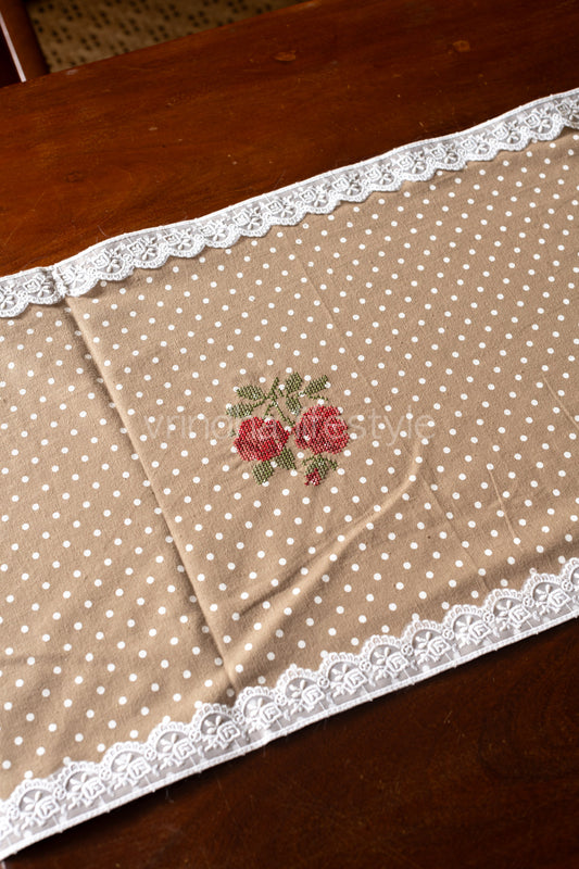 Polka dot cotton table runner with cross stitch embroidery and lace detailing -4 seater -13.5x62 inches