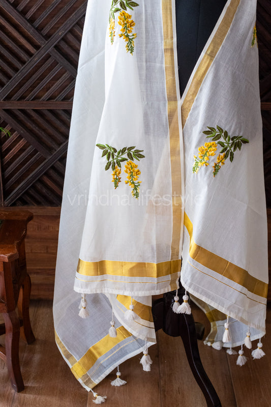 Embroidered Kerala Kasavu dupatta with tassels-Kanikonna