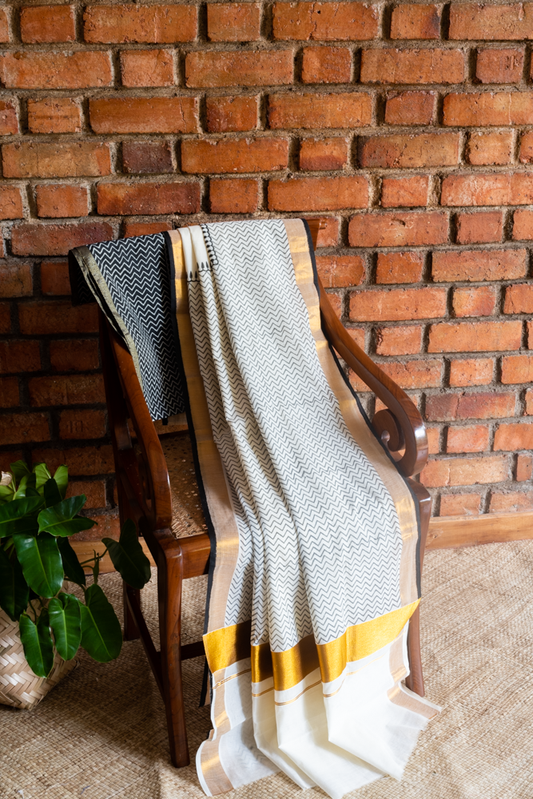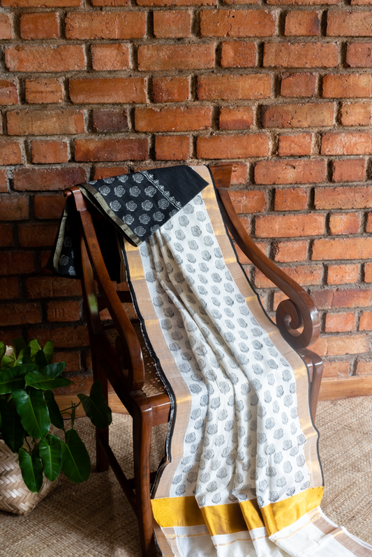 HANDBLOCK PRINTED KERALA KASAVU SAREE-Black