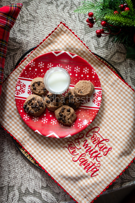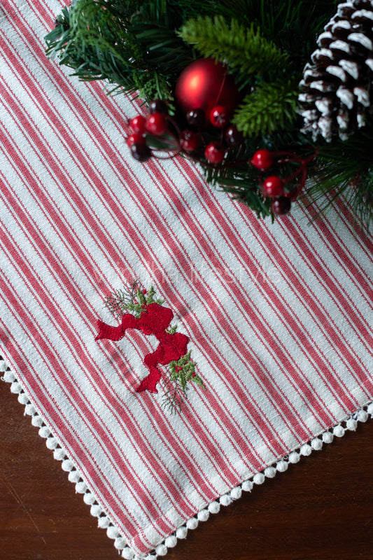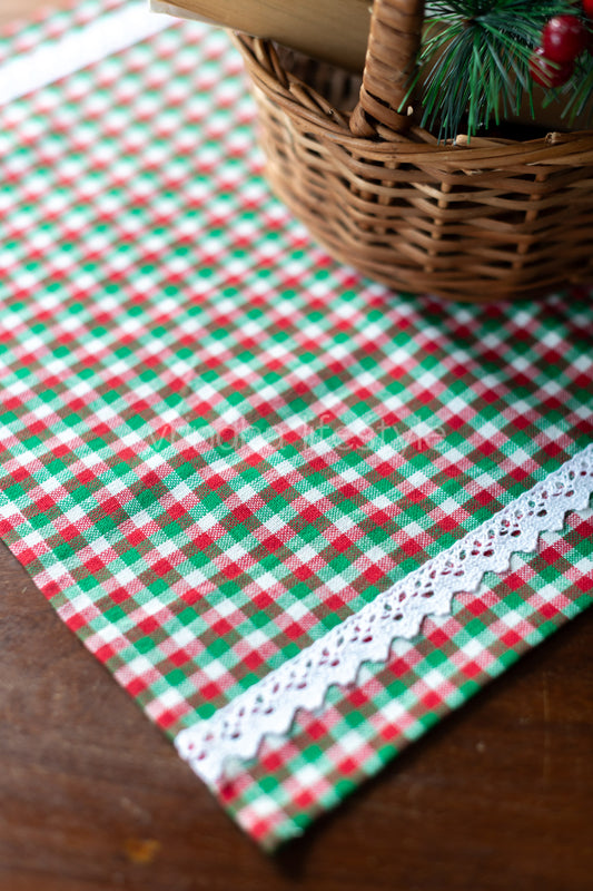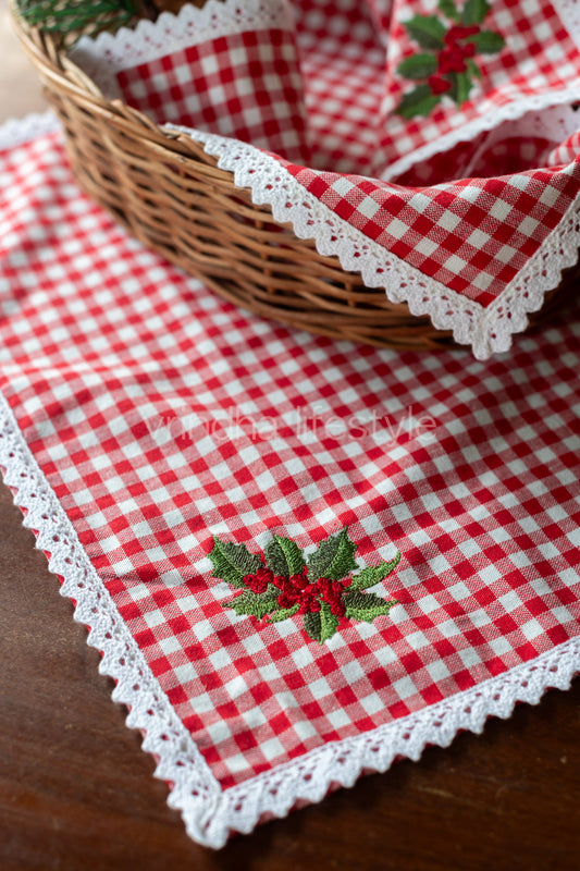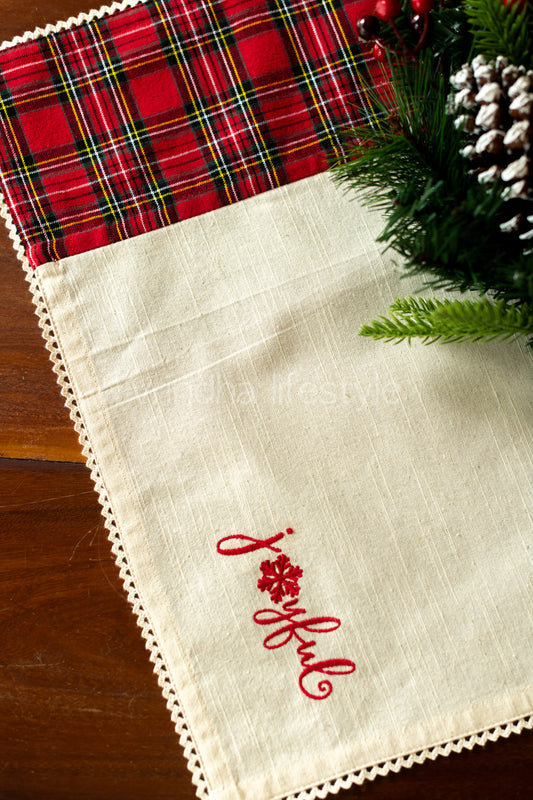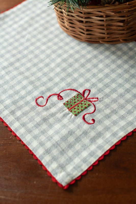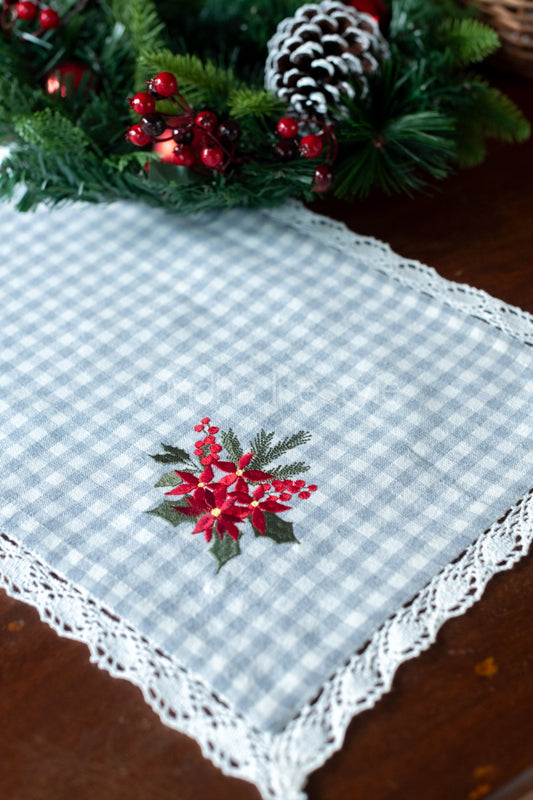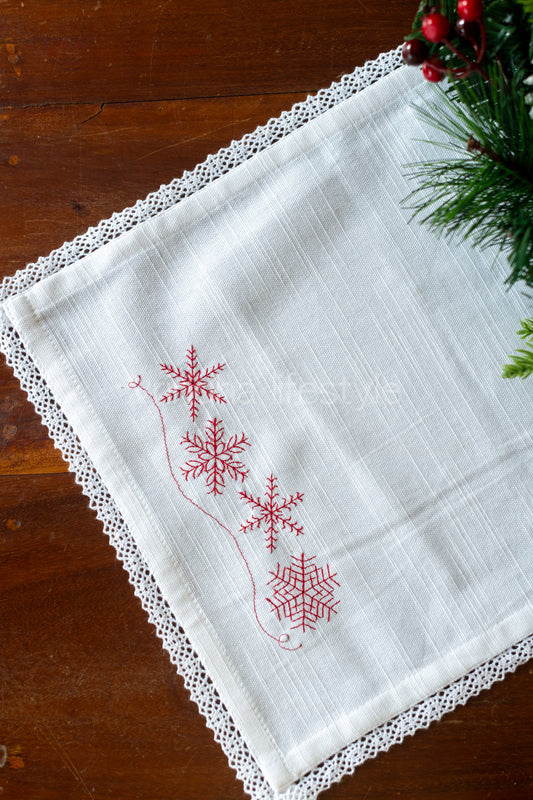 Cotton slub tray mat with cross stitch embroidery and lace detailing