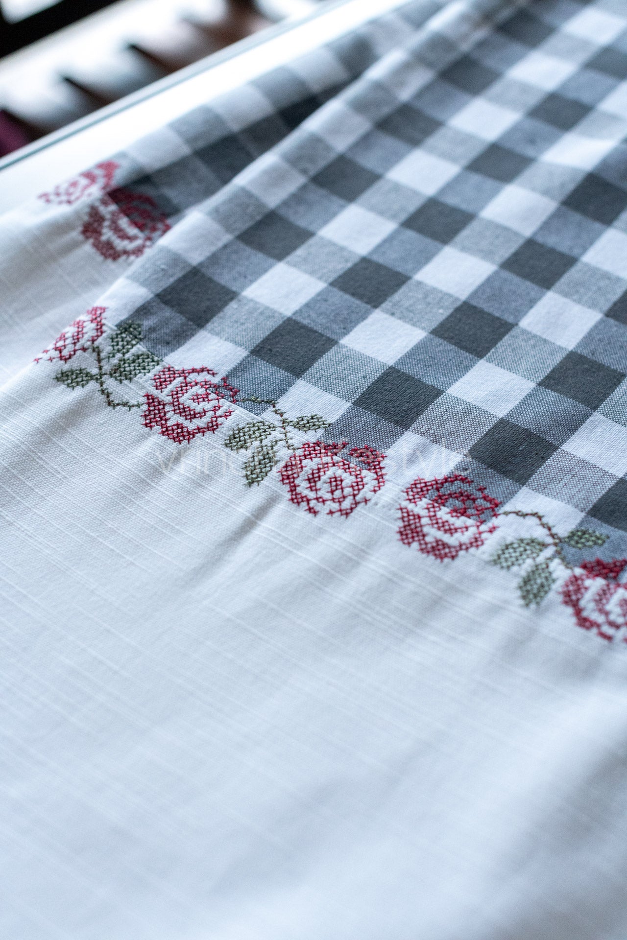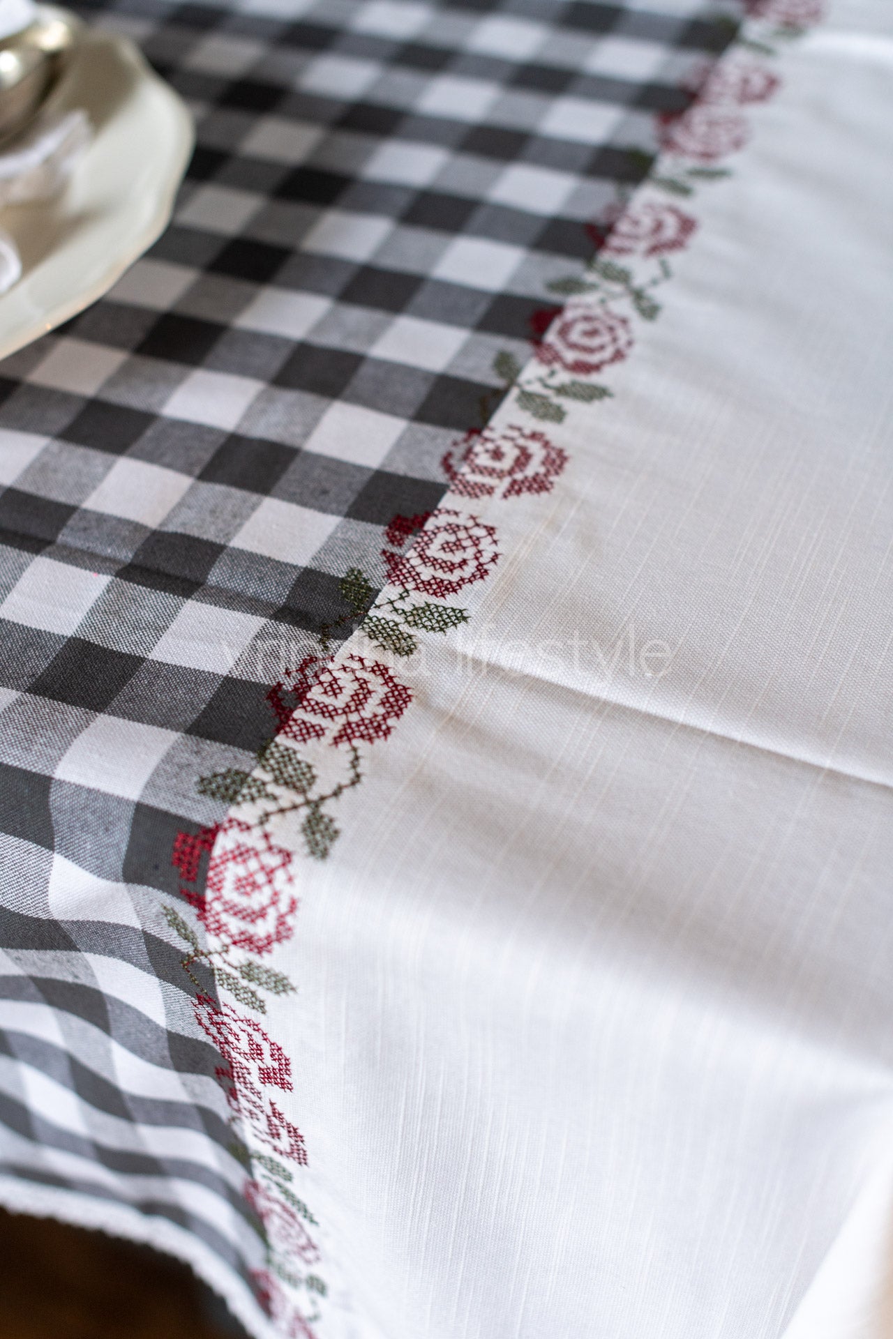 - Fabric: cotton, with cross stitch embroidery on both sides (short sides)of the table cloth
