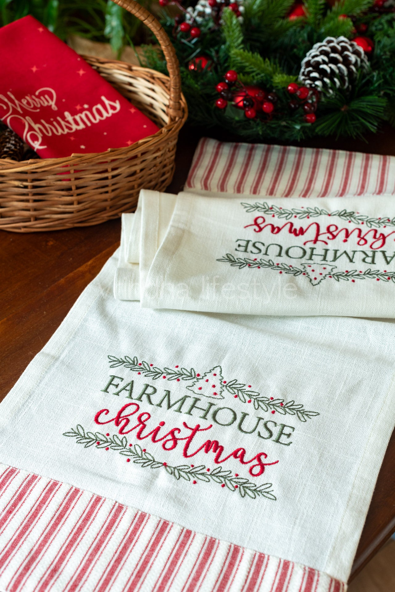 Woven cotton table runner with embroidery and frill