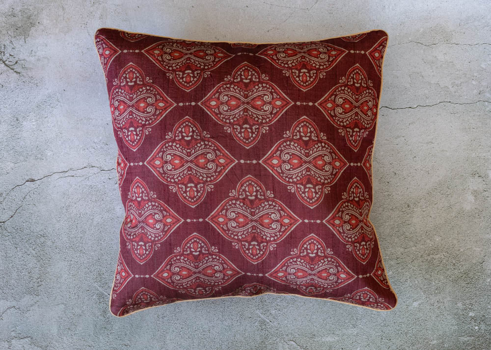 Maroon printed cushion covers in pure silk with matching piping and zipper closing at back.